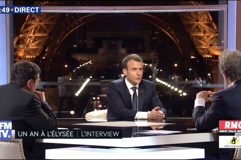 Les amoureux et spécialistes des interviews présidentielles se feront un plaisir de décortiquer cet exercice inédit, qui marque un tournant bienvenu en la matière. L’affiche en elle-même avait une certaine intensité, qui devait sans doute autant au moment social exceptionnel de l’ère Macron qu’au duo inédit d’intervieweurs (Jean-Jacques Bourdin et Edwy Plenel). La Syrie a donné le ton (voir l’article de Denis Sieffert) : la parole présidentielle ne suffira pas et les intervieweurs ne sont pas là pour servir la soupe. Ils se posent avant tout comme journalistes « relais » des citoyens. Côté Macron, les réponses se font sans notes, avec aisance. Les échanges sont directs, ce qui n’empêchera pas Emmanuel Macron d’emprunter parfois une langue de bois digne de « l’ancien monde » : _« Je veux qu’on réussisse » succède à « il faut chercher les causes et trouver les bonnes réponses » avant un « je veux relancer l’activité économique pour une plus grande cohésion sociale ».