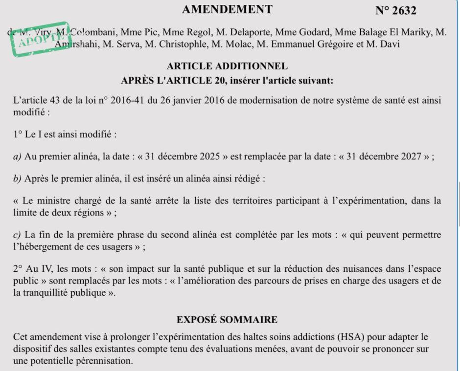 Le personnel de la HSA nous alertait sur la nécessité de prolonger l’expérimentation, qui offre un cadre sécurisé aux usagers de drogues les plus précaires. Il faudrait même aller plus loin et pérenniser définitivement ce dispositif ainsi que déployer de nouvelles structures sur le territoire national. Cela fait dix ans que ces structures existent en France et leurs impacts positifs ont été solidement documentés notamment par l’INSERM et l’IGA-IGAS.