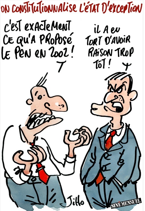 Déjà, qu’un gouvernement veuille imposer une réforme constitutionnelle en plein état d’urgence est un crachat à la figure de la démocratie. Je ne connais pas une démocratie qui fasse ça. En plus, ce qu’ils prévoient, ce sont des procédures de recul de l’état de droit. Constitutionnalisation de l’état d’urgence ? Mais pourquoi faire alors que la loi est très bien outillée ? La loi du 20 novembre qui a prorogé de trois mois l’état d’urgence a déjà gravement introduit l’arbitraire dans cette loi puisqu’elle permet désormais les interpellations non plus sur la base d’« activités suspectes » mais de « comportements suspects ». Ensuite, je rappelle que l’état d’urgence viendrait s’ajouter à deux autres états d’exception : les pleins pouvoirs au président (art. 16) et l’état de siège (art. 36) en cas d’agression extérieure (on peut comprendre) mais aussi en cas d’insurrection ! Tant que ces deux verrues sur notre loi fondamentale ne seront pas retirées, je considère qu’on aggrave les risques, surtout si le pouvoir revient entre les mains les plus réactionnaires.