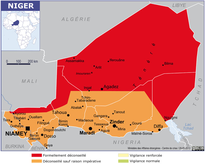 Sur cette carte, la totalité de la région administrative d’Agadez est en rouge, avec comme conséquences directes l’asphyxie de l’économie « licite » de la région et la réduction drastique de l’assistance humanitaire pour près de 1.000.000 personnes, la plupart des ONG s’étant retirées par mesures de précaution (à l’exception du CICR, OXFAM, Croix-Rouge Française).C’est essentiellement suite à la prise d’otages de 7 salariés d’AREVA et SATOM à Arlit en 2010 que la carte a été ainsi coloriée.Quatre ans plus tard, la carte reste inchangée. Curieusement d’ailleurs, car Diffa à l’extrême Est du pays, à la frontière du Nigéria/Etat fédéral de Borno et fief de Boko Haram, est resté en orange malgré les incursions régulières de Boko Haram dans cette zone.